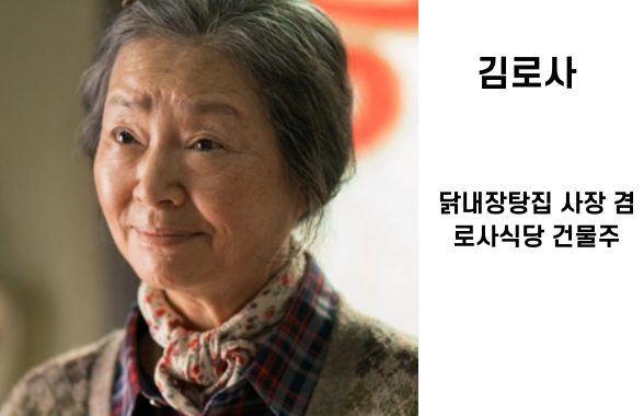 - 김로사는 서울에서 닭내장탕 하나로 30년 장사를 이어온 ‘로사식당’ 사장입니다. 겉은 엄격하고 폐쇄적이지만, 과거엔 시인이었고 지금도 장학금을 기부하는 반전의 인물입니다.