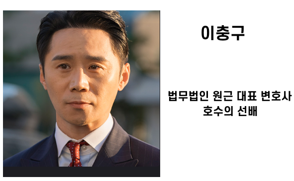 - 이충구는 호수가 소속된 로펌의 대표 변호사로, 냉철한 이성주의자이면서도 호수에게 남다른 애정을 보이는 후견자 같은 존재입니다.